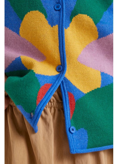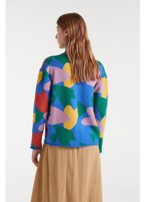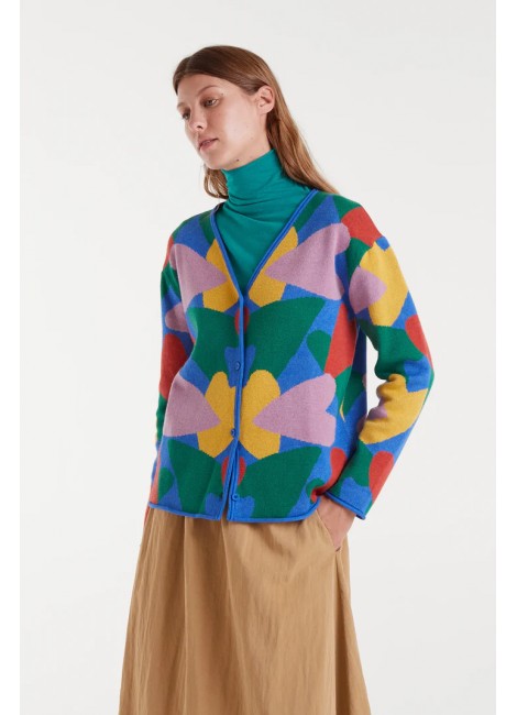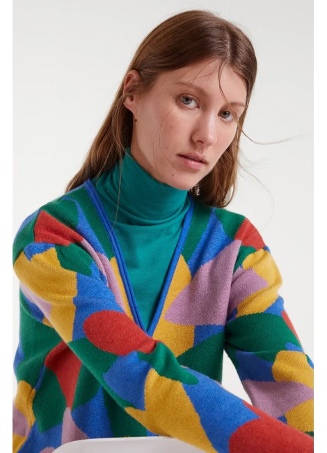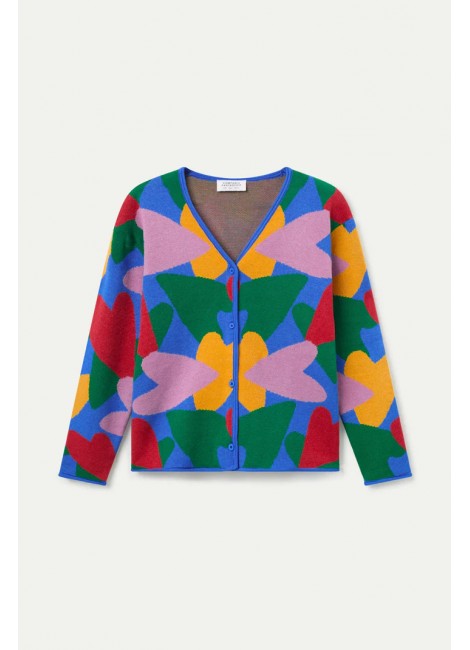 Cárdigan jacquard con estampado cupido. Cuello pico y manga larga. Cierre frontal con botones. La modelo mide 177 cm y lleva la talla S.