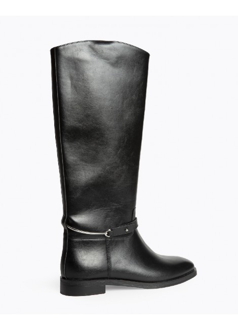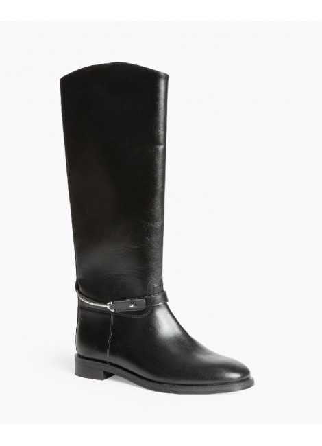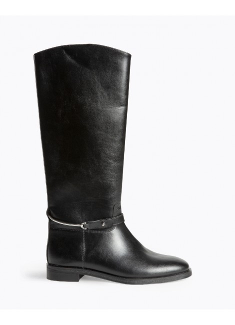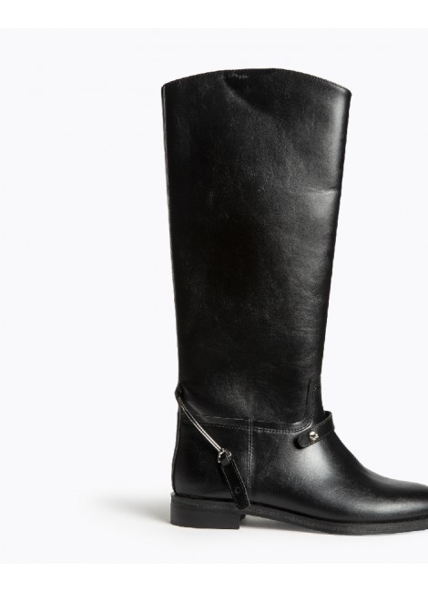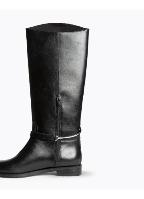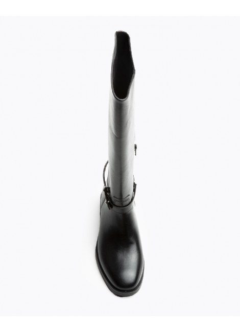 Bota plana, estilo hípica. Cremallera en el lateral. Caña lisa, espolón desmontable. Acabado en punta redonda.