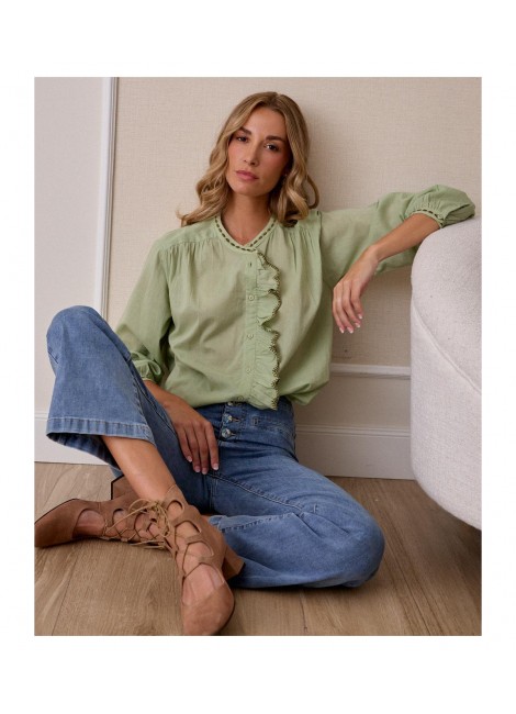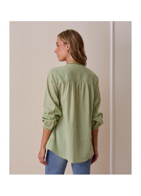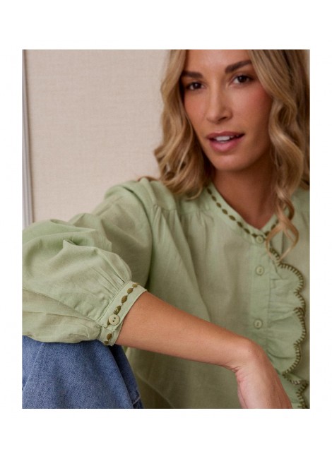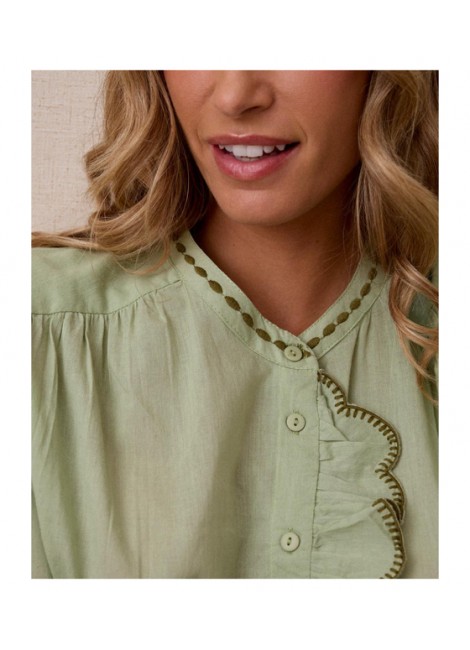 Blusa en color verde kaki con volante decorativo y bordado. Cuello redondo y cierre frontal con botones. Manga larga con detalle bordado en el bajo y puño fruncido.