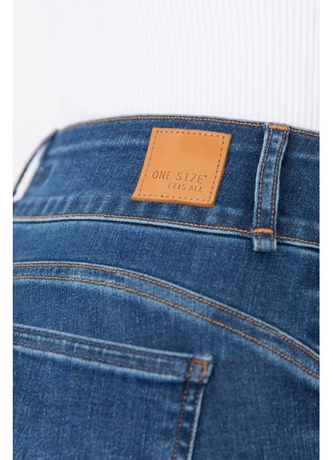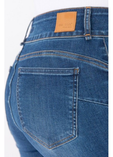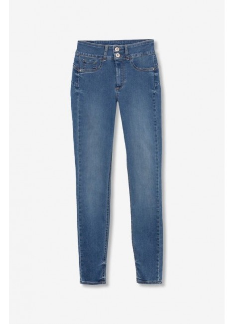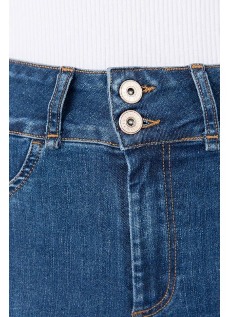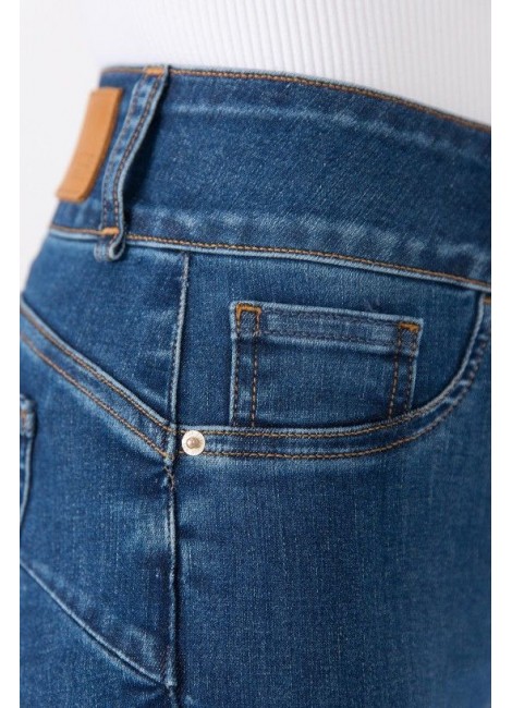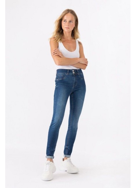 Jeans ajustados de tiro alto con tres bolsillos. Cierre frontal con cremallera y botones metálicos. Bolsillos falsos delanteros. Efecto push-up.