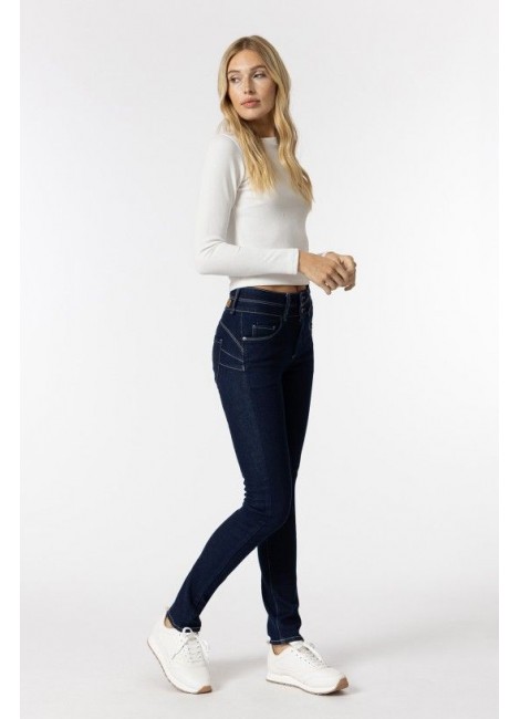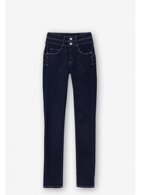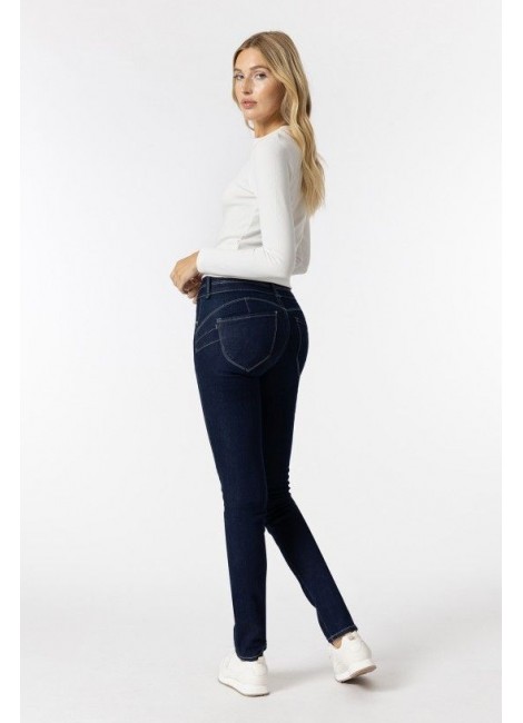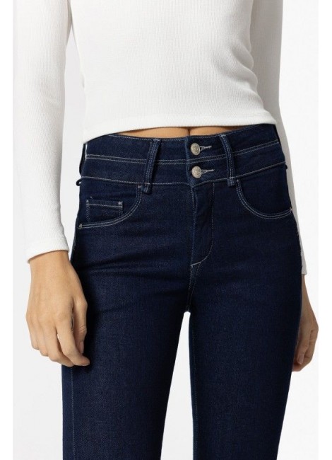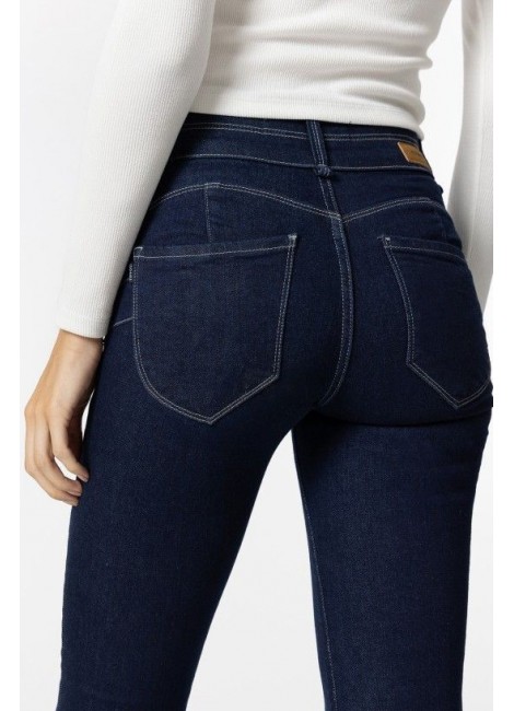Jeans de tiro alto con cinco bolsillos. Cierre frontal con cremallera y botones metálicos.