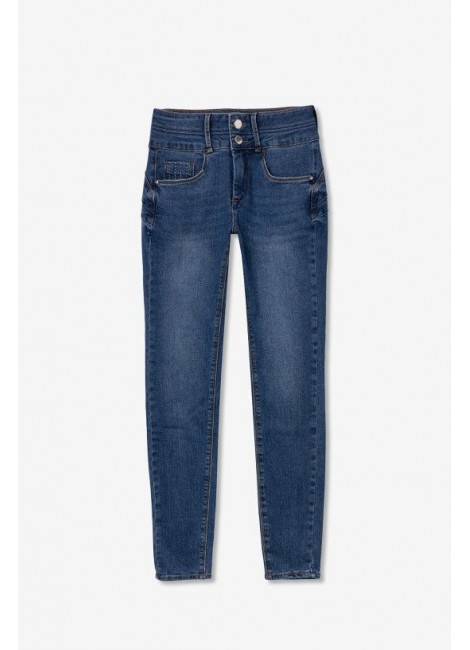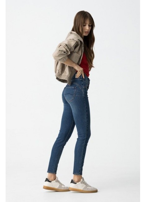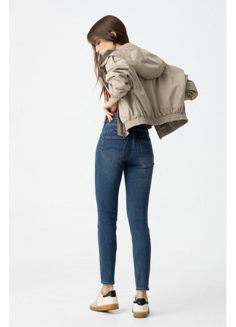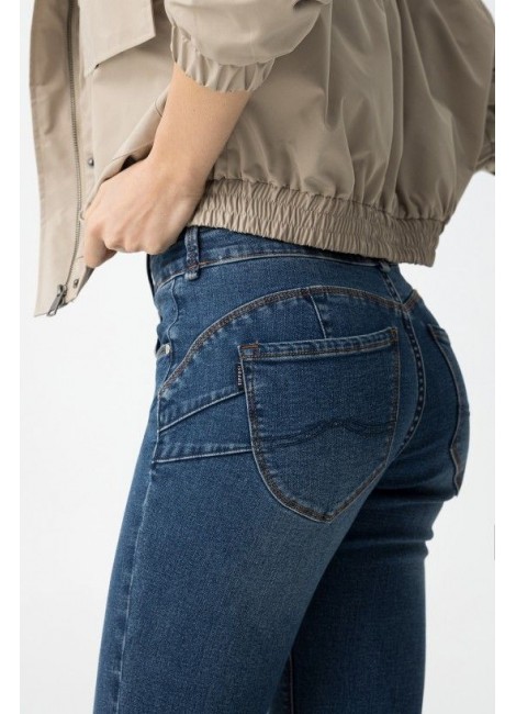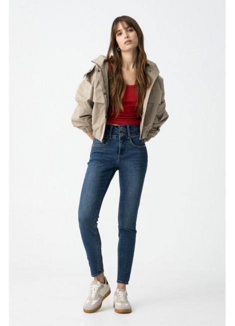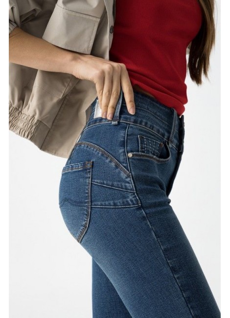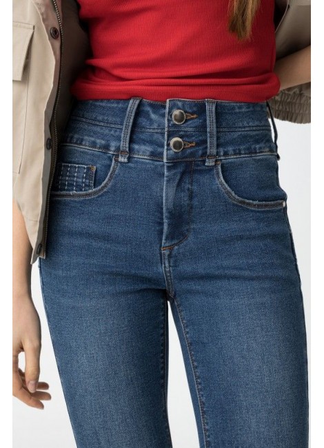 Pantalones ajustados de cintura alta con cinco bolsillos. Cierre frontal con cremallera y botones metálicos. Efecto push-up y push-in.