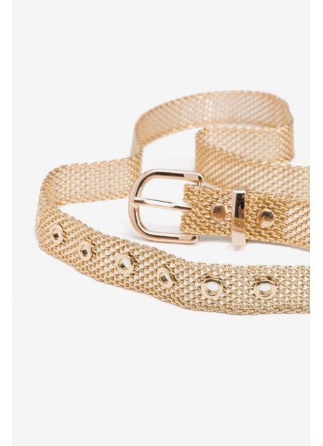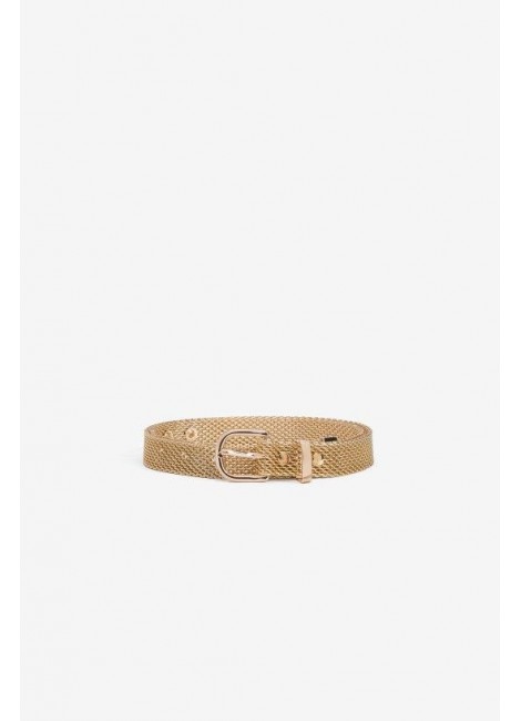 Cinturón metálico de diseño ancho con hebilla dorada. Dispone de 7 agujeros para ajuste.