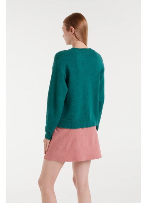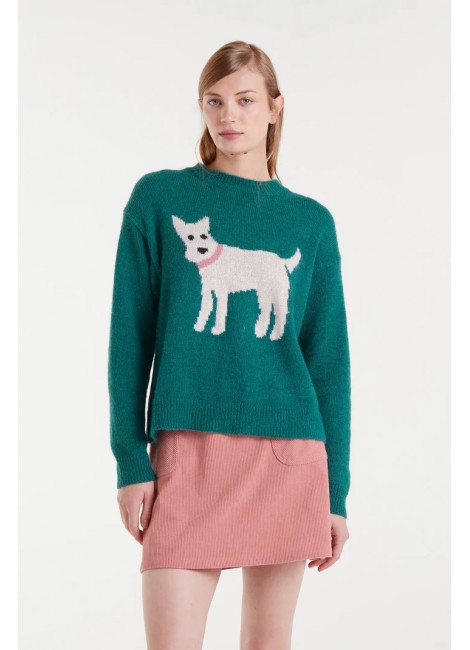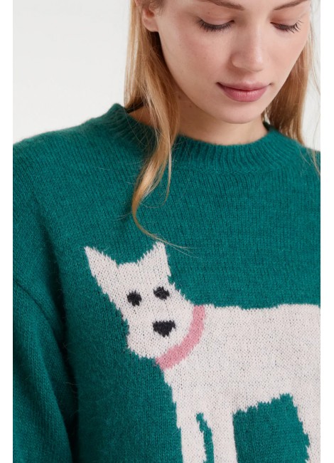 Jersey de punto jacquard de color verde con estampado perro schnauzer. Cuello redondo y manga larga con hombro ligeramente caído. Detalles con acabados en rib. La modelo mide 179 cm y lleva la talla S.