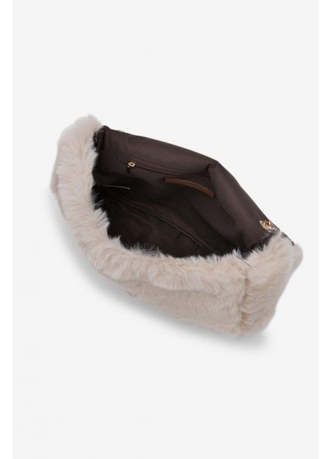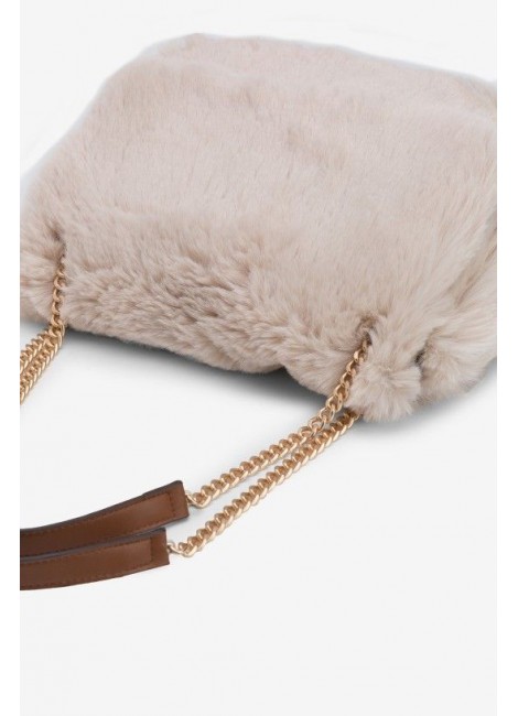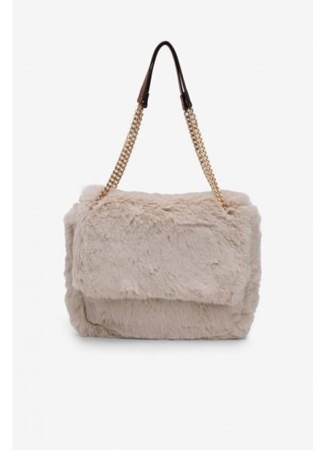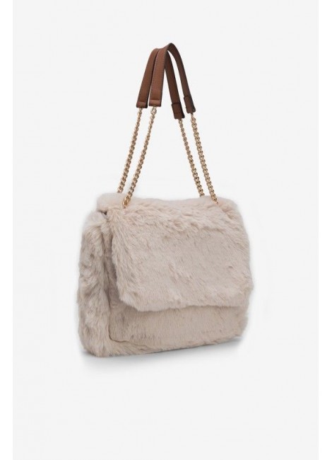 Bolso bandolera de pelo sintético, con solapa y cierre magnético. Asa ajustable combinada con cadena. Bolsillos interiores. Tamaño mediano. Dimensiones: 33 x 29 x 13 cm