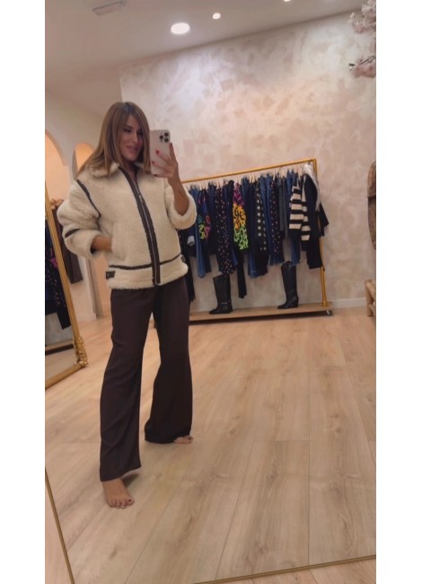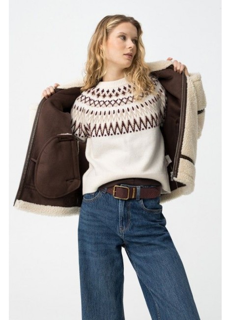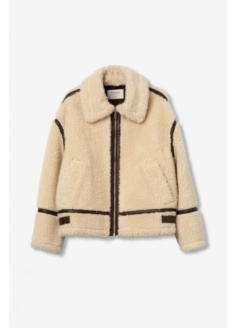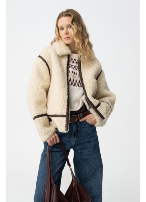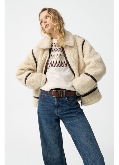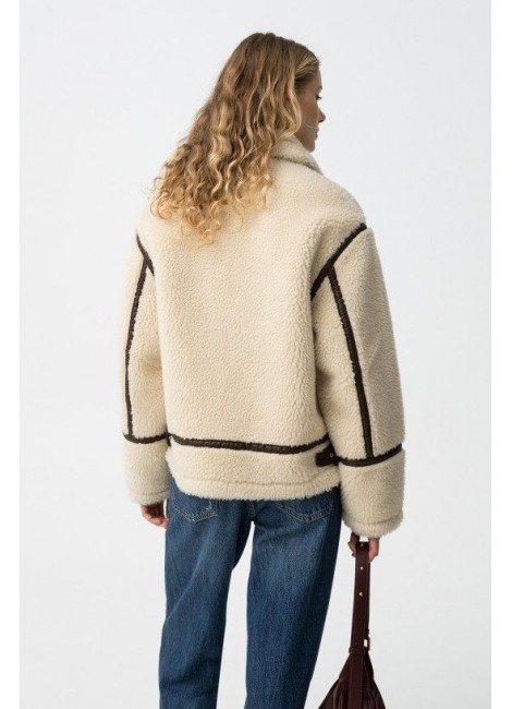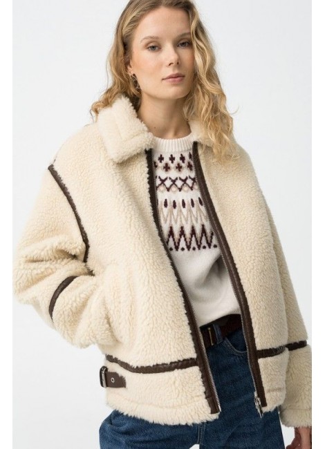 Abrigo relaxed fit de borreguito sintético con contraste de efecto piel, dos bolsillos, cierre de cremallera y hebillas decorativas. Cuello y manga larga.