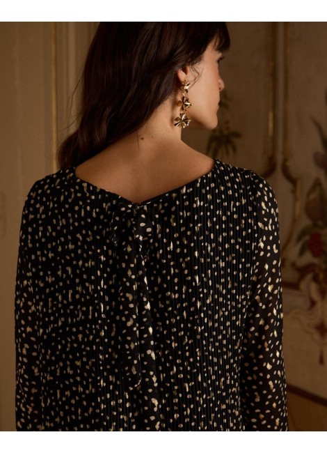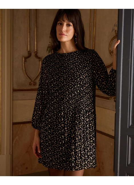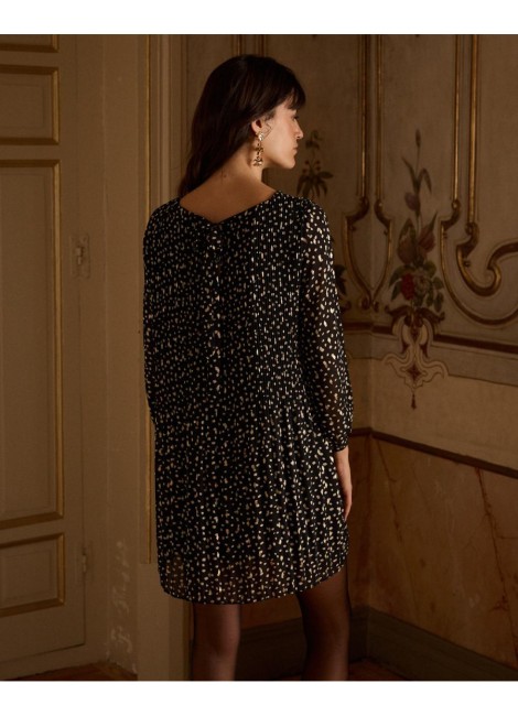 Vestido corto con estampado de lunares en color marrón. Escote en pico cruzado con corte bajo el pecho. Modelo de manga larga terminada en puño. Falda corta con detalle de doble volante en el bajo. Cierre mediante cremallera lateral. Dispone de forro interior.