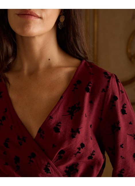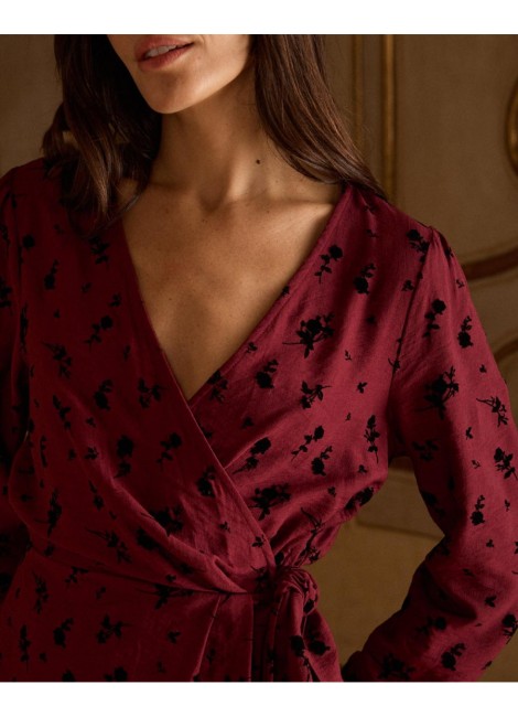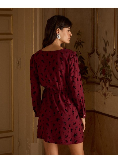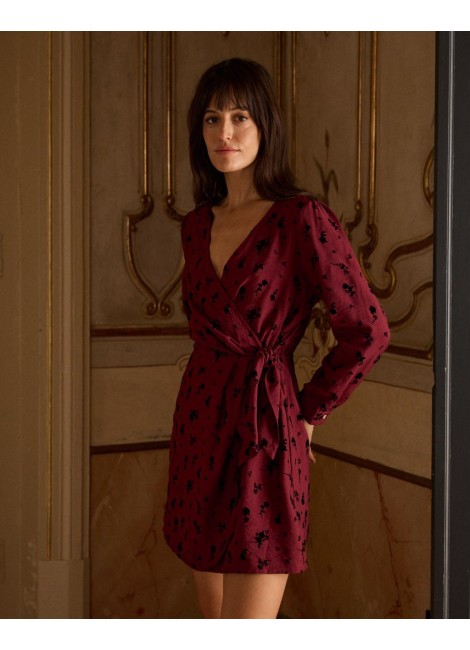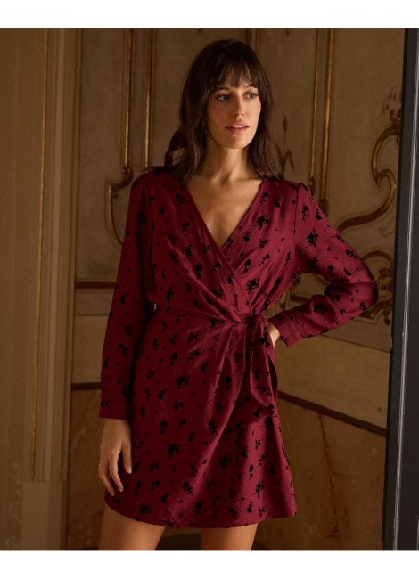 Vestido corto con estampado de lunares en color marrón. Escote en pico cruzado con corte bajo el pecho. Modelo de manga larga terminada en puño. Falda corta con detalle de doble volante en el bajo. Cierre mediante cremallera lateral. Dispone de forro interior.