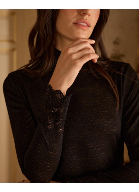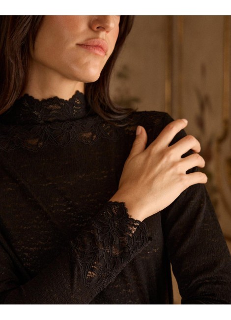 Top de encaje y punto en color negro, con un elegante diseño de cuello alto y mangas largas. Las mangas tienen un sutil detalle de encaje en sus puños.