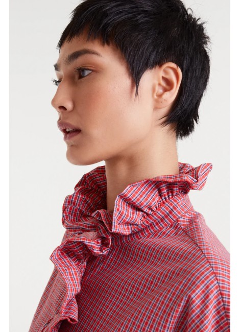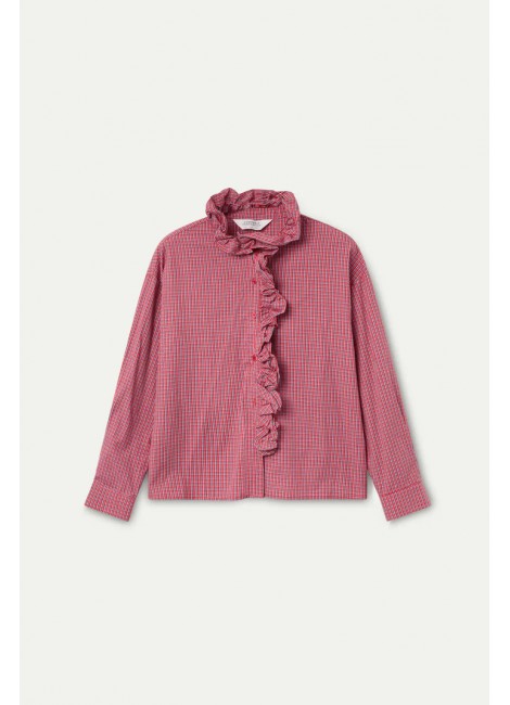 Camisa con tejido 100% algodón con estampado cuadro vichy de color rojo. Cuello alto con volantes y manga larga terminada en puño con botón. Cierre frontal con botones y detalles en volantes. La modelo mide 177 cm y lleva la talla S.