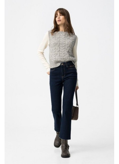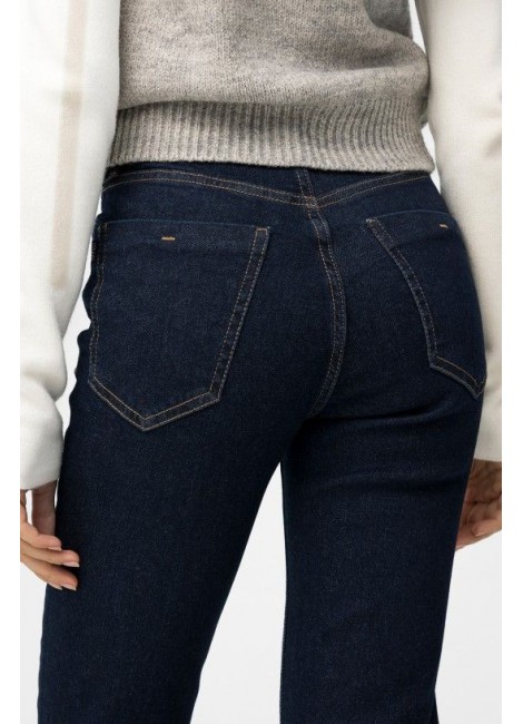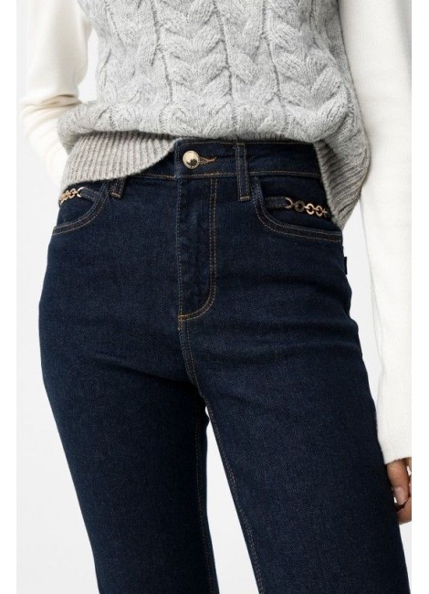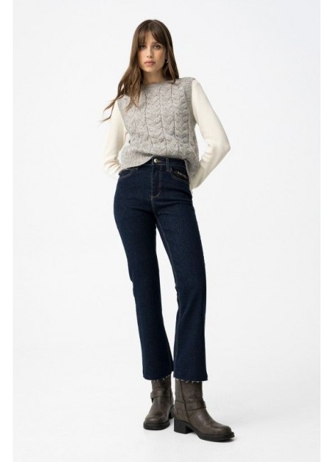 Vaqueros de corte cropped flare en azul oscuro con detalles metálicos en los bolsillos delanteros.