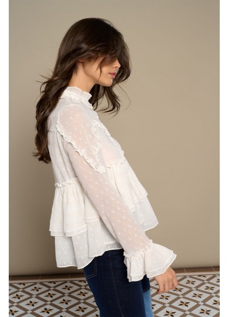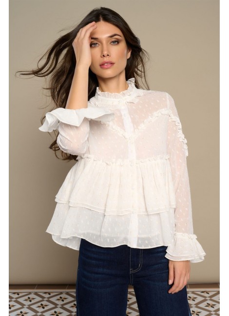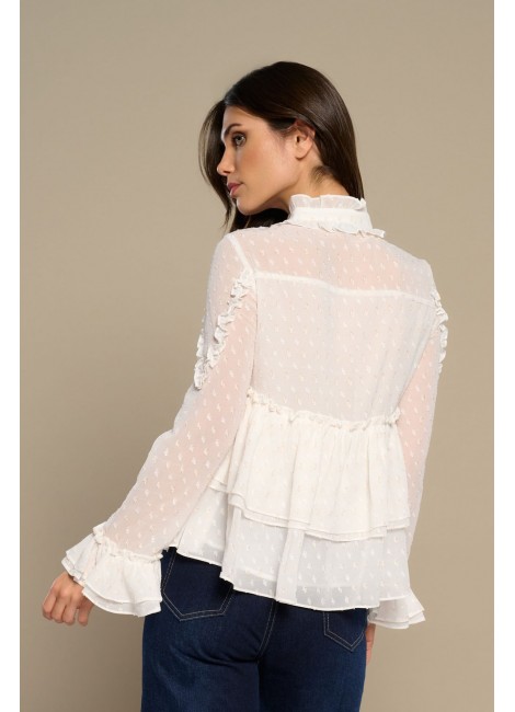 Blusa de chiffon son cuello caja y manga larga. Detalle de volantes en cintura y puños. Forro interior.