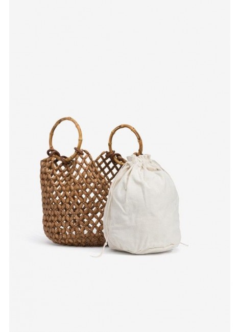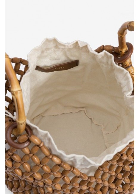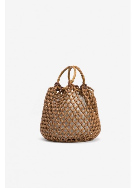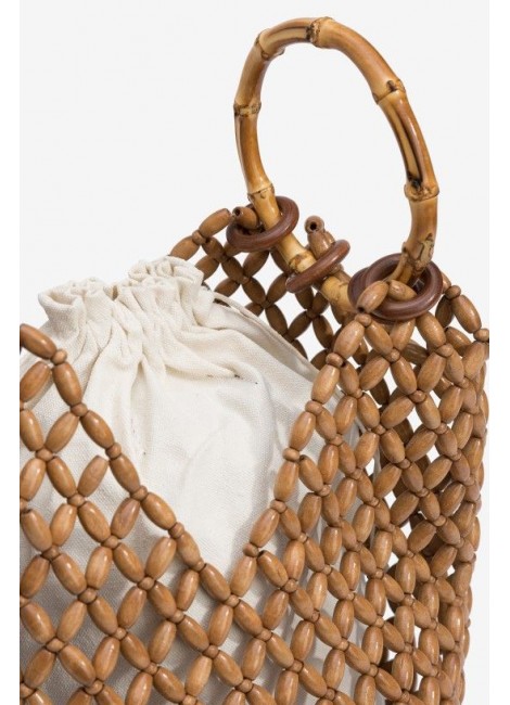 Bolso bucket marrón con diseño de cuentas y asas de bambú. Incluye bolsa interior blanca.