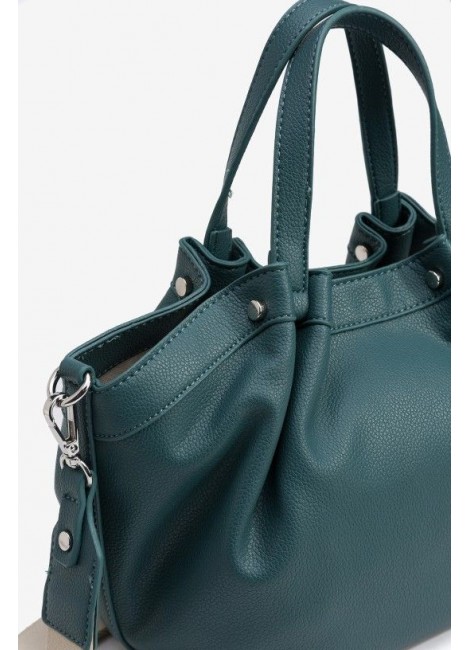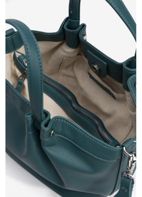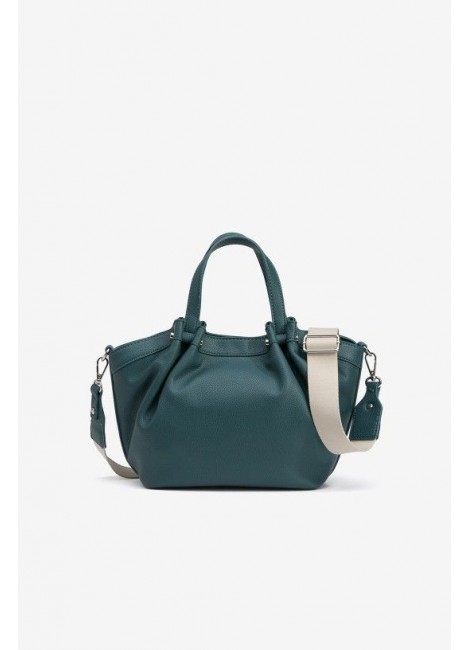 Bolso verde con asa ajustable beige, cierre magnético y detalles metálicos plateados elegantes.