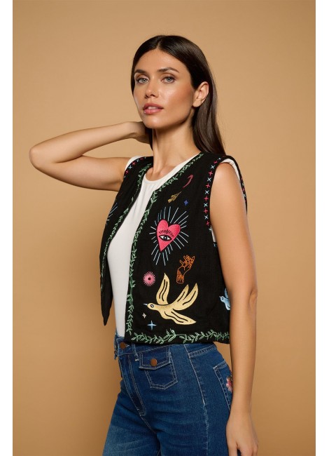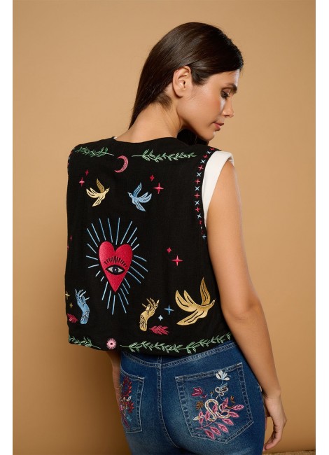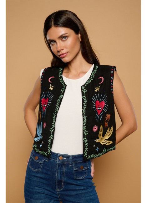Chaleco de cuello redondo. Diseño abierto. Bordados de inspiración mística que incluyen corazones con ojos, aves y motivos celestiales. Ribete de hojas verdes bordadas en contorno. Tejido mezcla de viscosa y lino. Forro interior 100% algodón.
