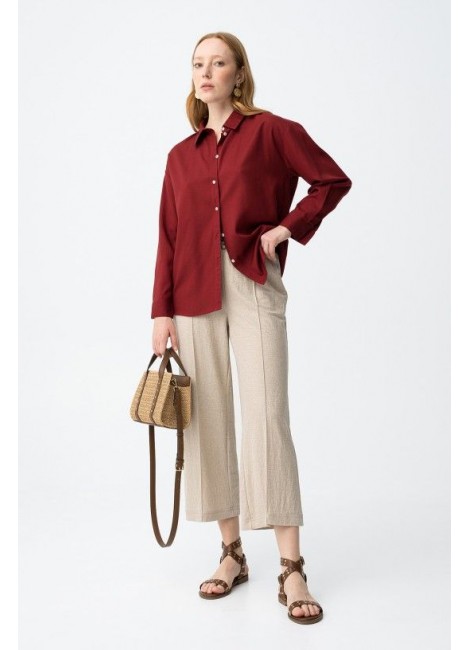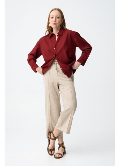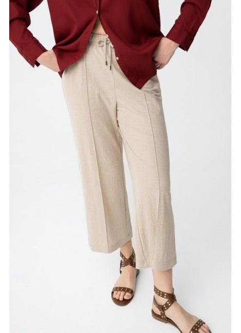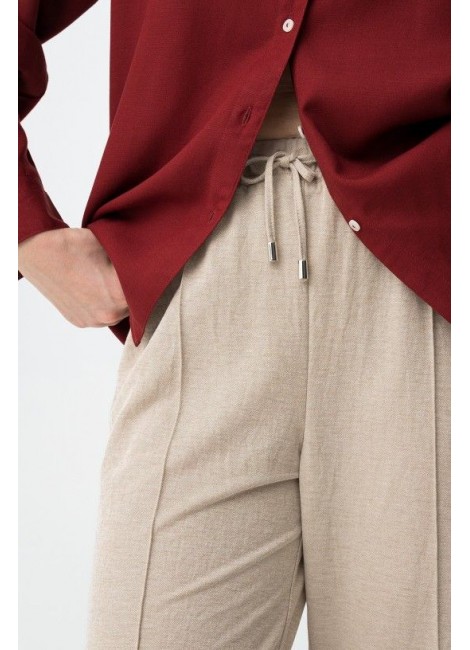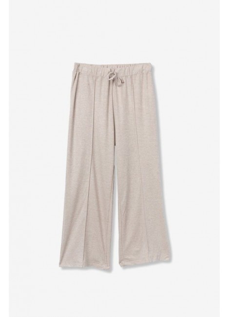 Pantalones de corte amplio en tono beige con cintura elástica y cordón ajustable para mayor comodidad.