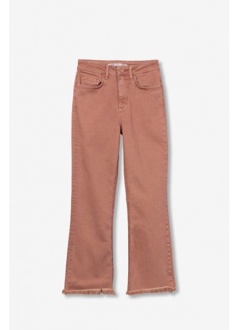 Vaqueros de corte cropped flare en azul claro, con cinco bolsillos y detalles deshilachados en el bajo.