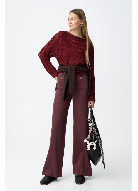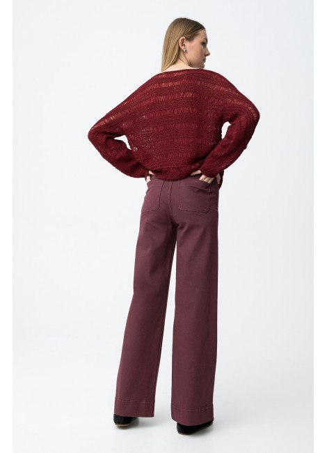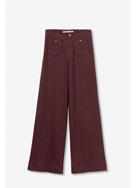 Jeans de corte ancho en color granate con bolsillos frontales y detalle de botones dorados.